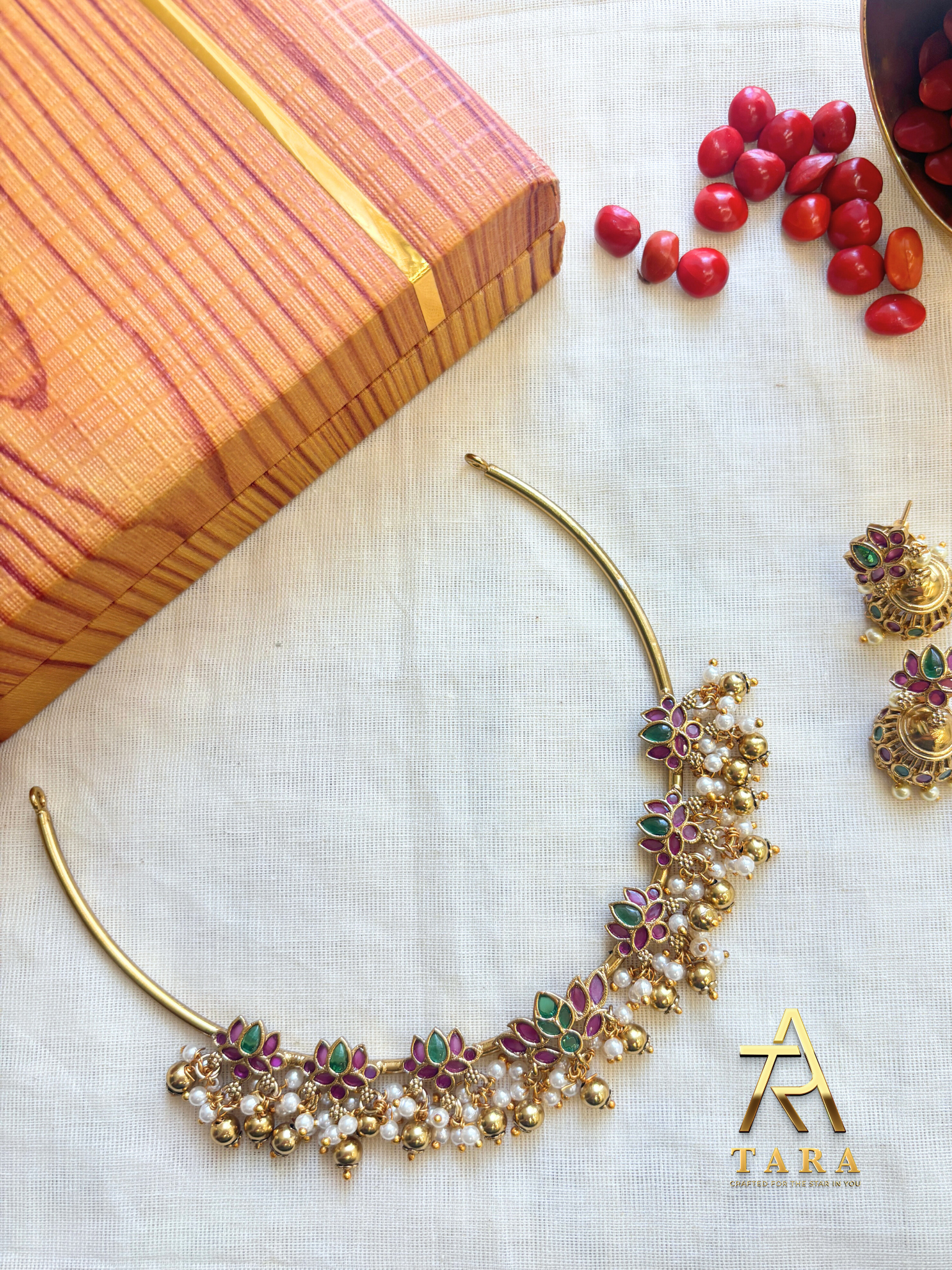 Premium finish Lotus Hasli Necklace featuring lotus motifs and pearl ghungroo beads.
